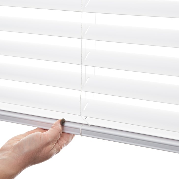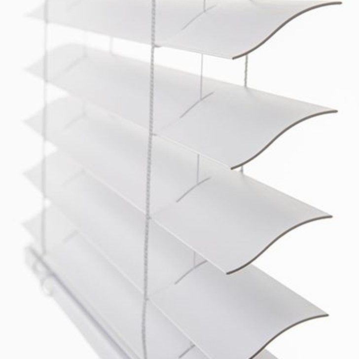 Finally, a contemporary, truly cordless blind perfect for the entire home at an affordable price! The American Blinds Trademark Cordless S-Curve 2 inch Faux Wood Vinyl Blinds operate completely from the bottom rail for effortless blade tilting and easy lift/lower operation. The 2” slimline curved slats come exclusively in a clean, modern white and provide exceptional room darkening when closed and wonderfully clear views when open.
