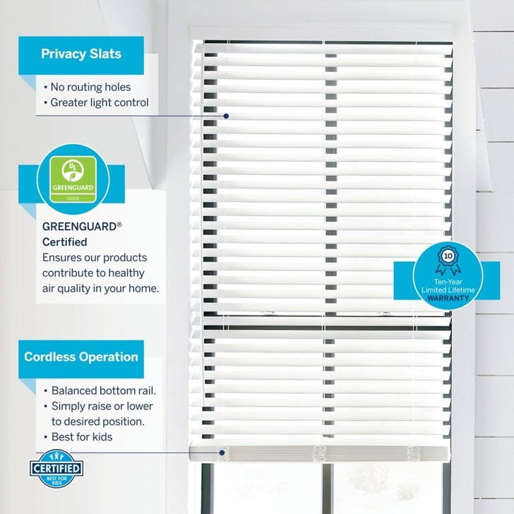 Get an upscale exterior view for less with the Cordless 2 Inch Classic Faux Wood Blinds by Levolor, featuring the unique look and style of real wood at an economical price. Optimize privacy and reduce leakage with privacy slats, which are also easier to slide out and clean, or consider a more eclectic look with decorative cloth tapes available in a variety of colors. Includes cordless lift with a left-side wand tilt. GREENGUARD Gold Certification ensures that our products contribute to healthier indoor air quality.