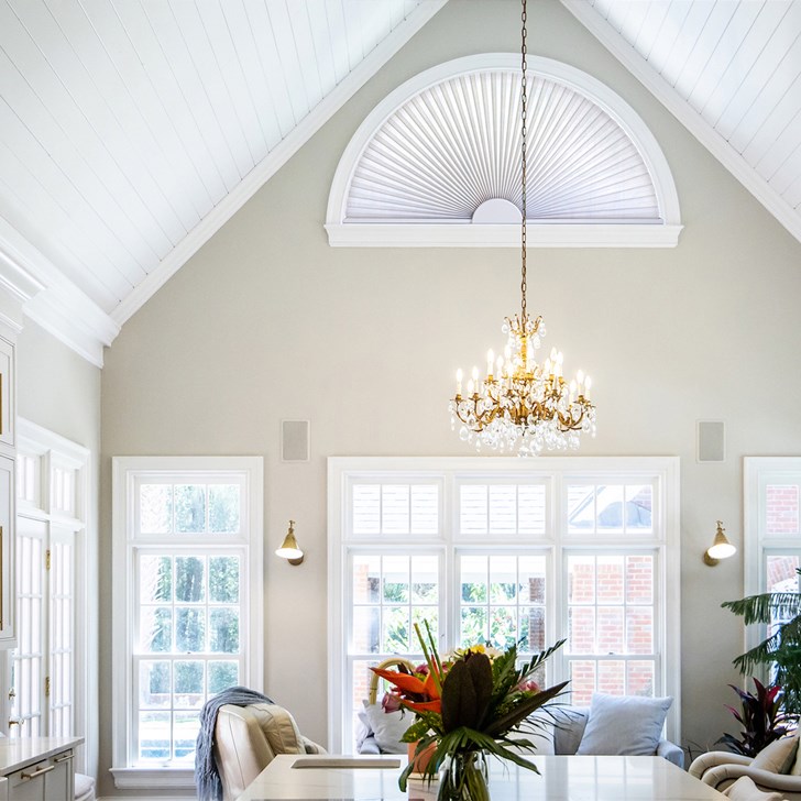 Legacy Blackout Cellular Arches from American Blinds are a great solution for covering the arch windows in your home. These windows often go untreated because of the limited choice of coverings and seemingly difficult dimensions, but the air pockets created by the honeycomb construction of these blackout cellular arches will help insulate your window against outside heat or cold, as well as protect your home’s interior from damaging sunlight and UV rays. Both practical and attractive, American Blinds Legacy Blackout Cellular Arches come in a palette of fashionable colors to match any décor in your home, while the white backing maintains a consistent appearance to the outside. American Blinds Legacy Blackout Arches are available in either 3/8”, 9/16”, or ¾” single cell, and in ½” double cell. This shade is available in a Perfect Arch configuration, where the arch’s height measures half of its width as well as an Elongated or Eyebrow Arch.