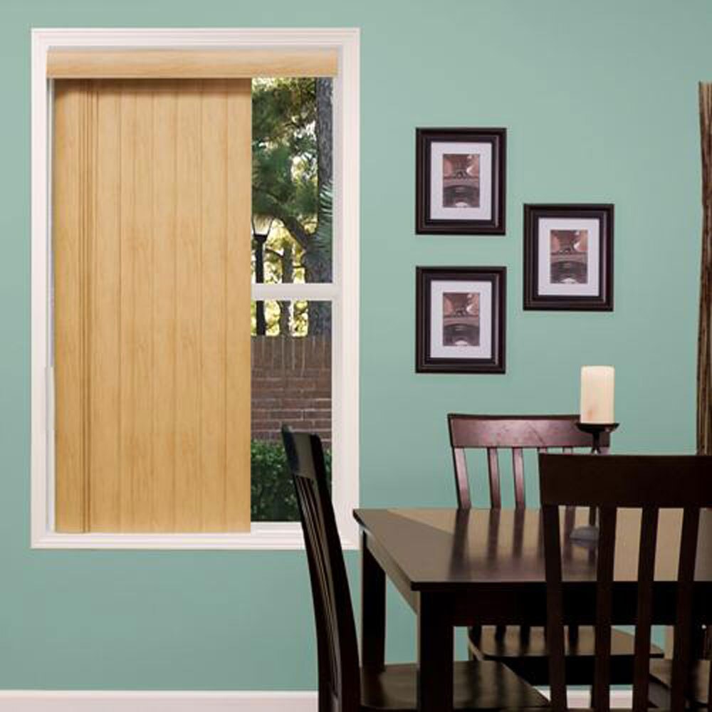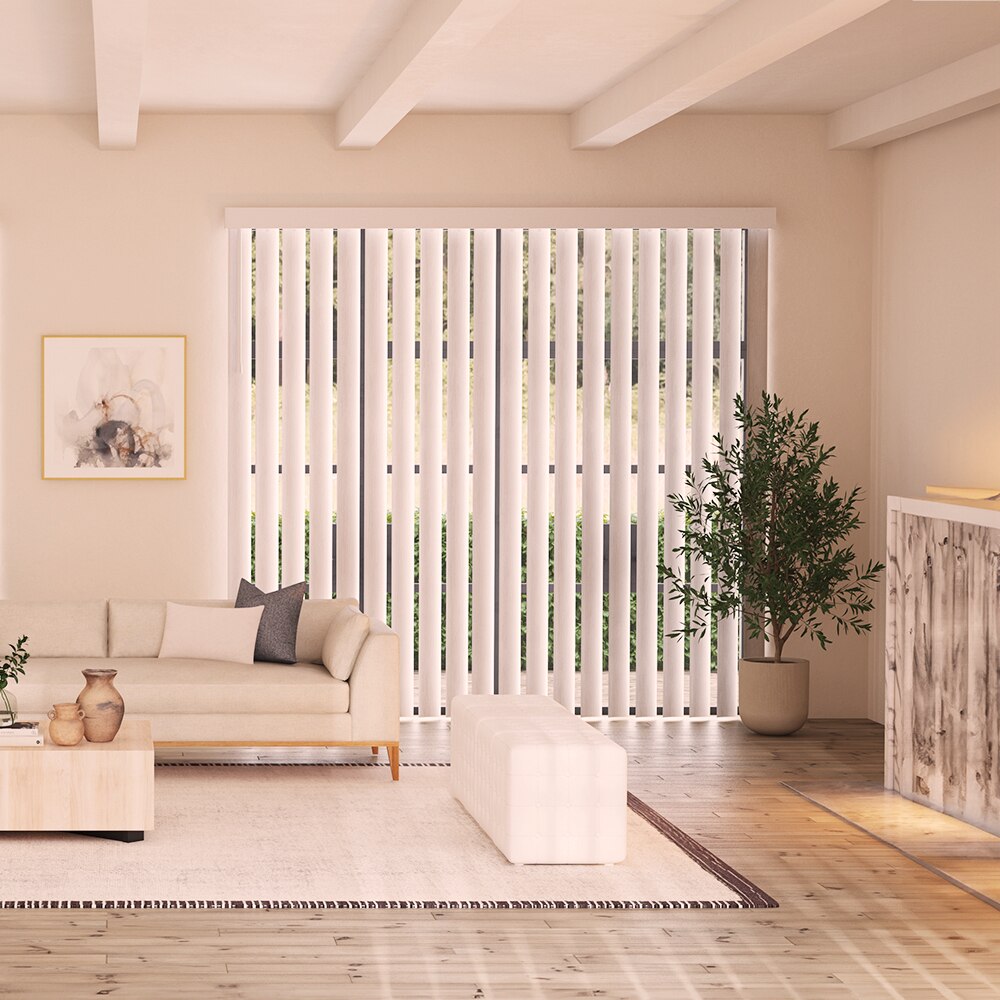 American Blinds Legacy Faux Wood Vertical Blinds give you the warm appearance of real wood in a beautiful range of textures, colors and finishes. Vertical blinds are an ideal treatment for patio doors and large windows. These faux wood blinds are durable and warp-resistant, which makes them perfect for high-humidity areas such as bathrooms and kitchens. The variety of color, finish and texture options available allow these blinds to work beautifully with any décor. There are several different stack options, so you can choose the best one for your room. Includes wand control and valance.
