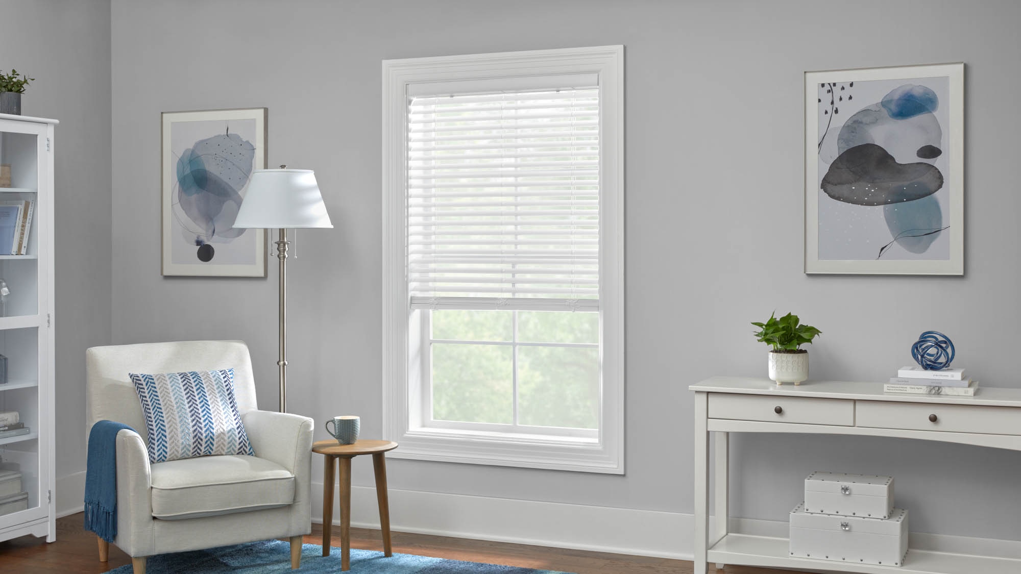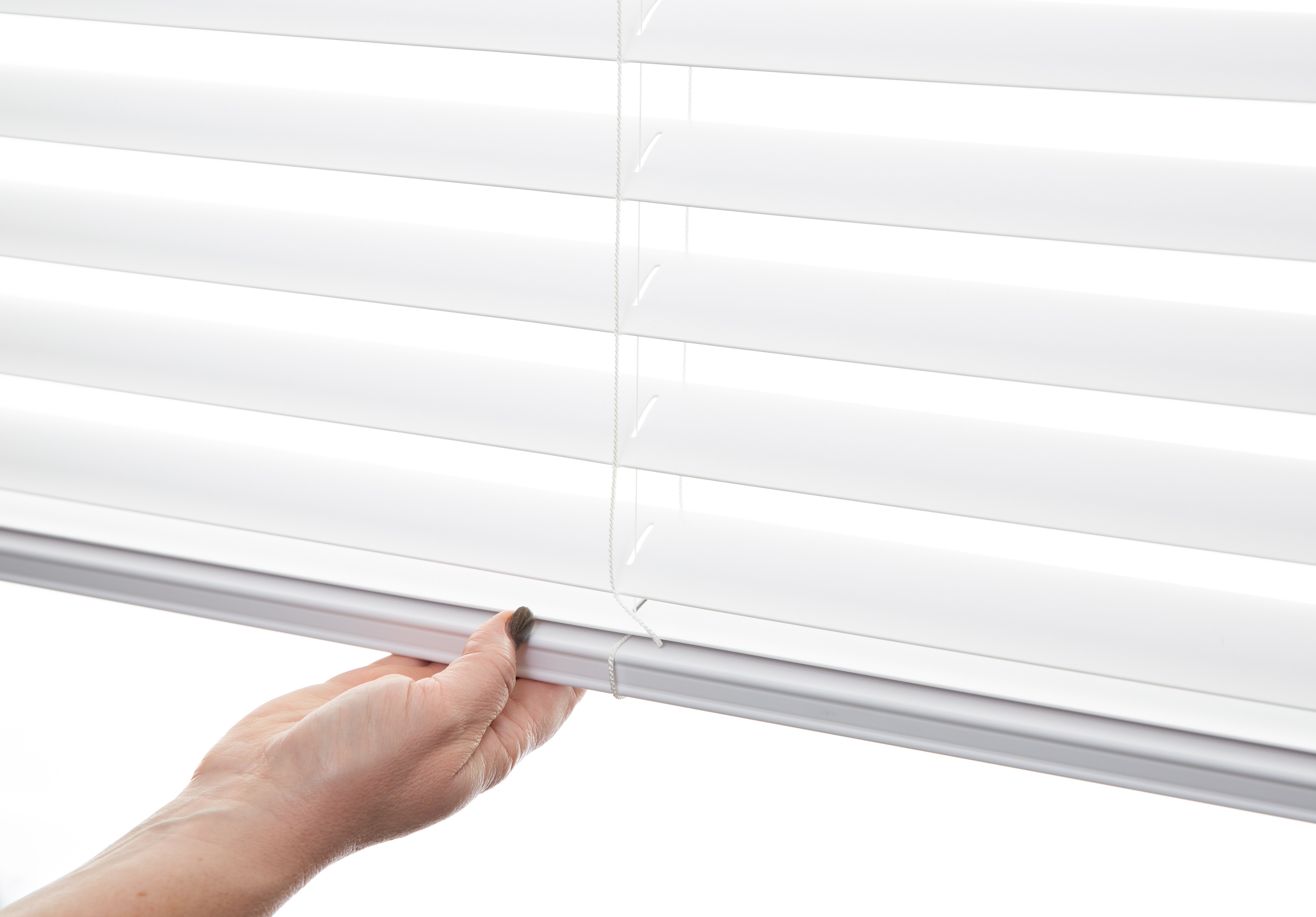 Finally, a contemporary, truly cordless blind perfect for the entire home at an affordable price! The American Blinds Trademark Cordless S-Curve 2 inch Faux Wood Vinyl Blinds operate completely from the bottom rail for effortless blade tilting and easy lift/lower operation. The 2” slimline curved slats come exclusively in a clean, modern white and provide exceptional room darkening when closed and wonderfully clear views when open.