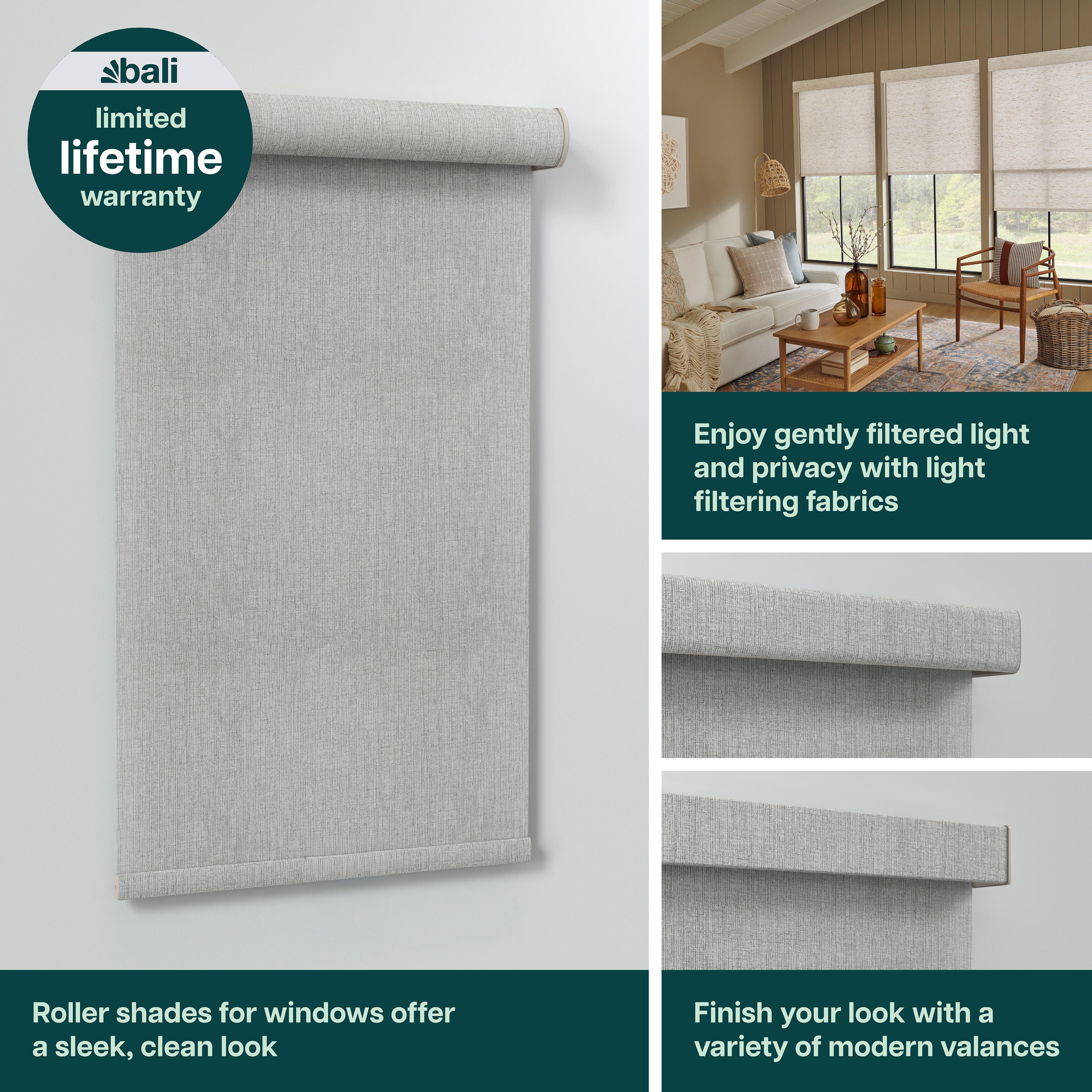 Bali Light Filtering Roller Shades offer several options for customization. Available in fresh colors, patterns and textures to meet any décor style. Personalize your Bali Roller Shades with a valance along with a variety lift options to meet your specific needs.