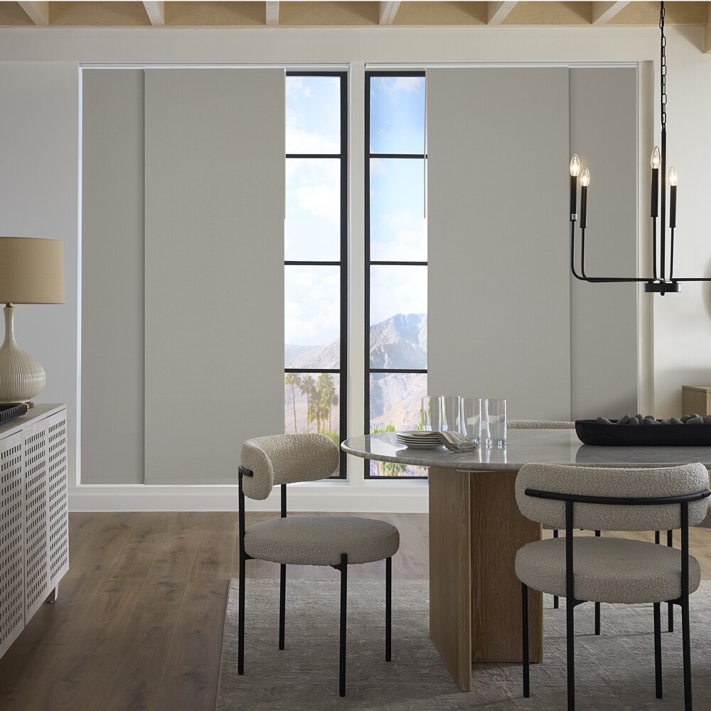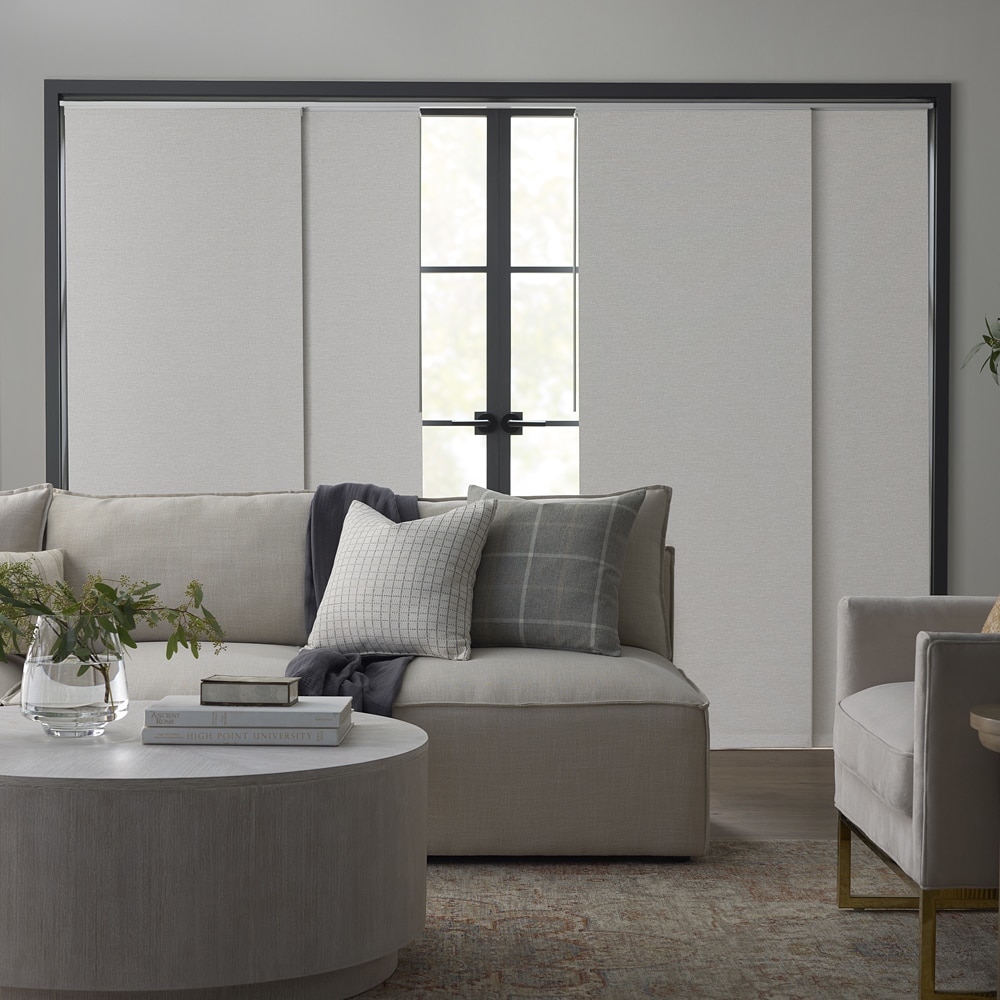 LEVOLOR Fabric Sliding Panel adds a sleek, modern style to your large windows or patio doors. Available in a beautiful assortment of fabrics and colors, these sliding panels offer different opacities: choose solar screen or light-filtering to allow more light through while still having some privacy; go with room-darkening or blackout if you want maximum darkness and privacy. Available with a wand control at no additional charge. Give your panel tracks a custom flair by adding a designer valance. Wand controls will be located on the same side as the stack.