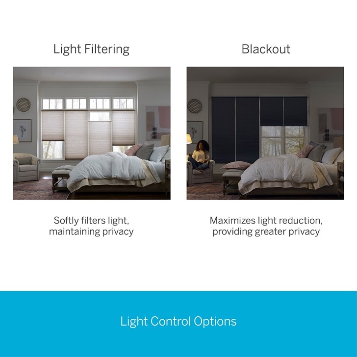Get superior insulation and the feel of soft light with the 9/16" Light Filtering Cellular Shades from Levolor. Available in 9/16 inch single-cell fabrics, these shades come in a wide range of décor-friendly colors, Choose from a variety of lift options to customize your shade. Cordless shades are safer for homes with children or pets, while giving the window a clean, finished look. Each cordless shade is spring motor activated so that the shade functions with a simple push or pull on the bottom rail. All rails are color-coordinated. Blackout fabric will be on the bottom portion of the shade.