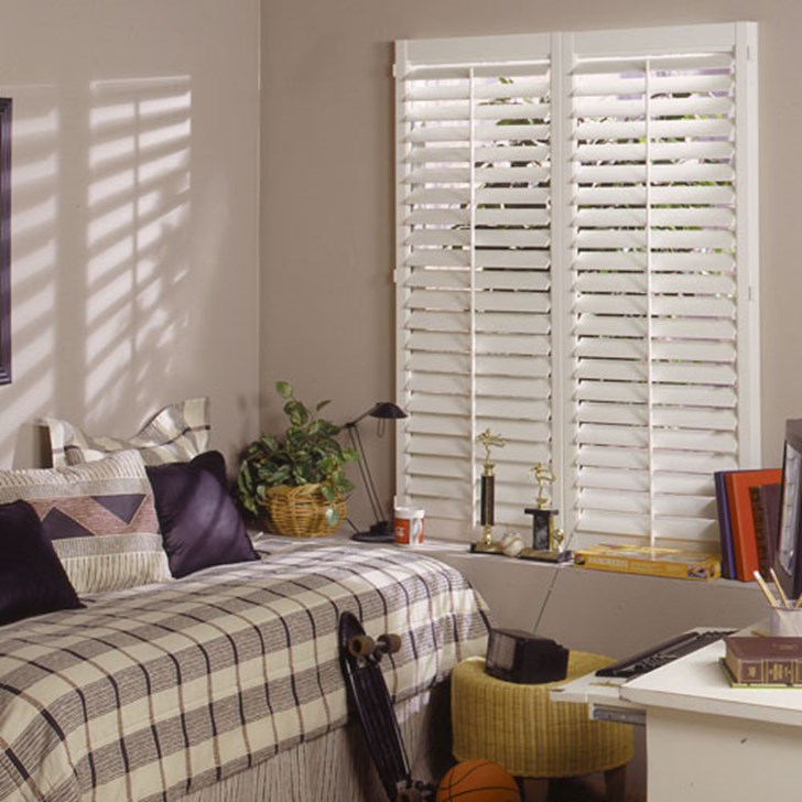American Blinds Trademark Faux Wood Shutters bring the sophistication of shutters to your home at an affordable price. The PVC composition provides long-lasting quality and resists fading, peeling, swelling, warping and cracking. These shutters also add insulation and energy efficiency lowering utility bills. Faux wood shutters are an eco-friendly choice and are easy to clean and maintain. Choose from a louver size of 3” or 4” and proprietary WoodTex® finish in your choice of white tones. An optional split-tilt rod will allow you to operate the top half of your shutter while the lower half remains closed, giving you both privacy and a view.